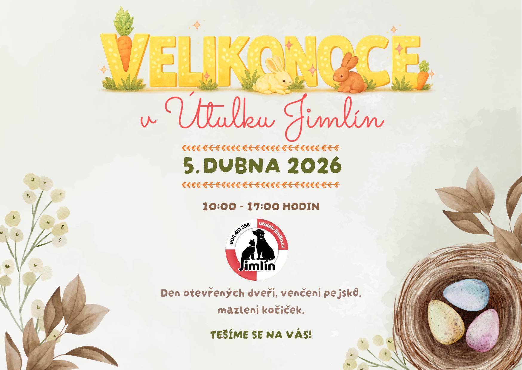 tak jako každý rok, tak i letos pro Vás chystáme Velikonoční setkání v našem útulku. Navštívit nás můžete v neděli 5. dubna 2026 od 10:00 do 17:00 hodin. Rádi Vás provedeme útulkem, budete moci vyvenčit či pomazlit naše pejsky a kočičky.