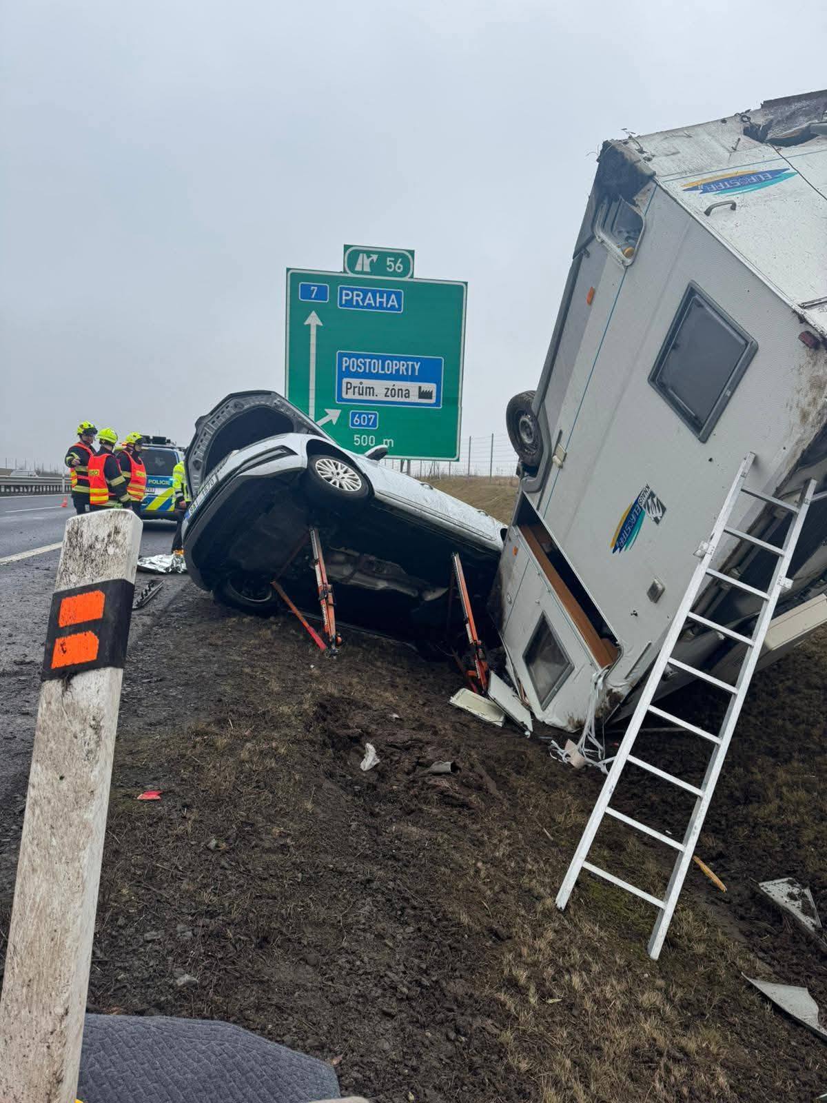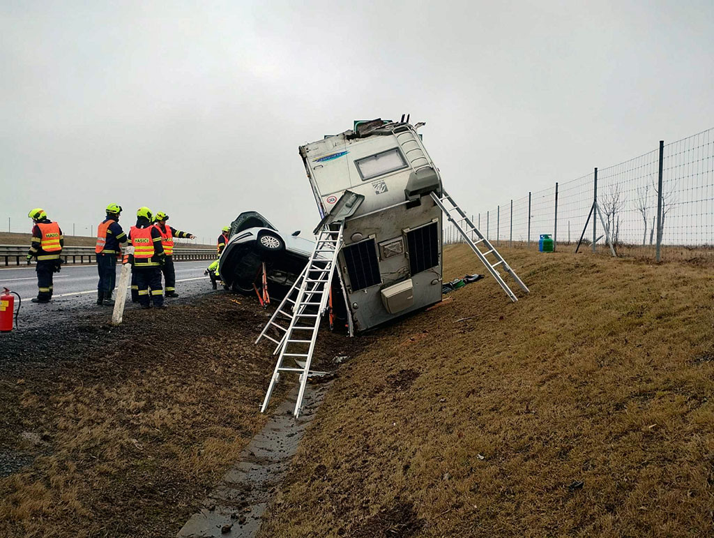 V obci Postoloprty na Lounsku zasahují profesionální a dobrovolní hasiči u dopravní nehody osobního vozidla, které táhlo karavan. Osobní vozidlo skončilo i s karavanem mimo komunikaci. Hasiči provedli zajištění místa nehody a zajištění karavanu proti pohybu. Událost se obešla bez zranění.